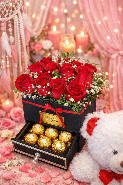 Caja especialemnte diseñada . contiene 12 rosas y ferrero.