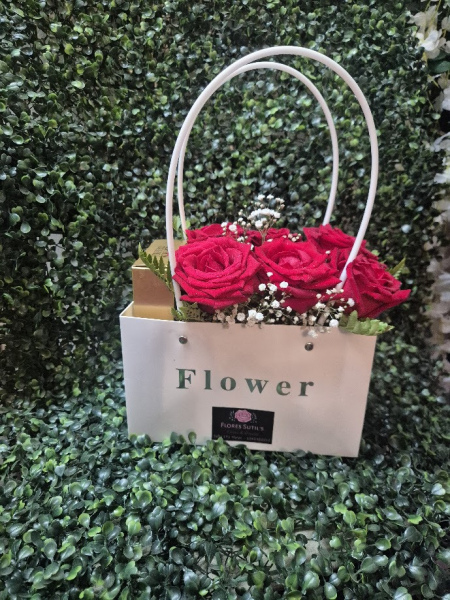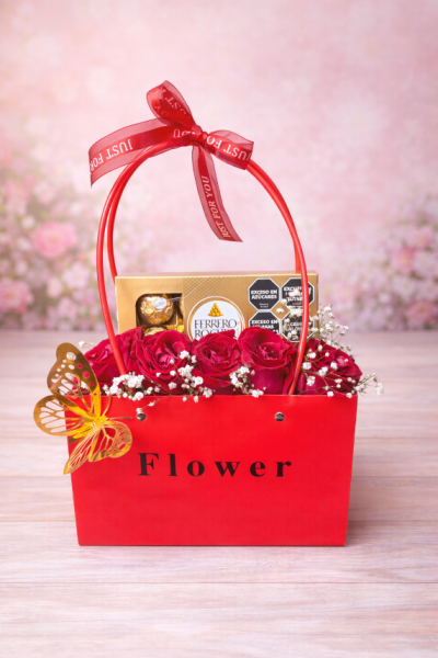 contiene 5 rosas rojas y ferrero de 8 unidades . El color de la base puede ser modificado segun stock