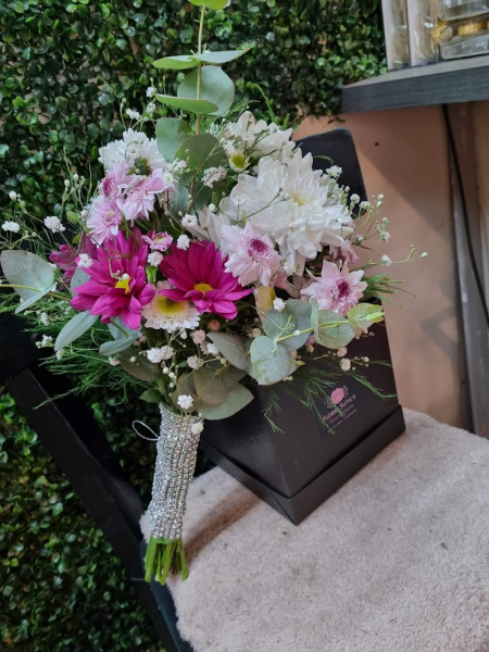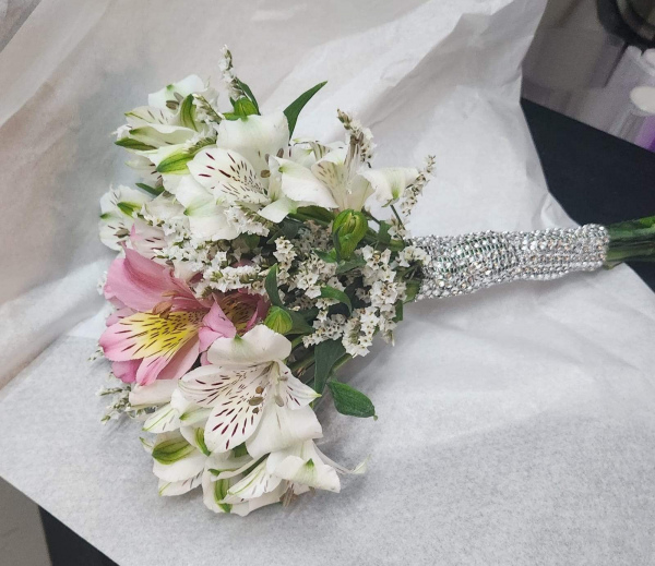 ramo de novia mediano boda o civil sencillo de flores silvestres como lisiantus , astromelias, margaritas o flores de estacion segun fecha.